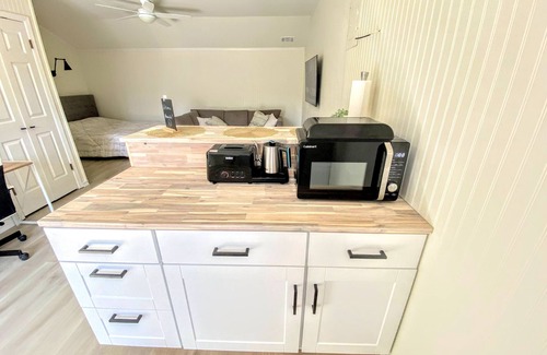 Brand new bathroom, kitchen, queen bed nook, and living area. All brand new appliances, linen, towels, etc-- we provide your basic traveling start pack!
