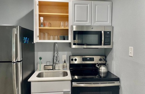 This 500 square foot, 1 bedroom, 1 bathroom, 1st floor apartment is updated with modern touches. Relax in your home away from home with a new king sized memory foam bed, a fully stocked kitchen with walk in closet and private patio.