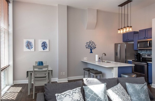 Each stylish apartment includes modern appliances, furnishings, and décor, tied together by the calming color scheme and eye-catching signature blue cabinetry in the kitchen. Open concept living spaces are welcome places for entertaining, each just a little bit unique from the others. Everyone will find a spot that speaks most to them, from the floor-to-ceiling windows with ample natural lighting in apartment #1 to the arched windows, urban views, and exposed brick of apartment #4.