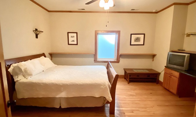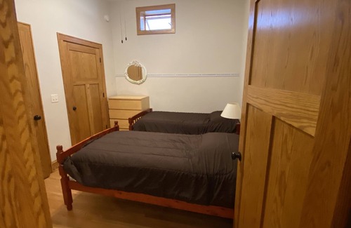 Enjoy your stay in Oak Park at this prairie architecture themed apartment. It is located in the lower level of a new construction home. As you enter, you will be blown away by the soaring 9-10' ceilings and open & airy layout. Spacious master bedroom with queen bed, dressers and walk-in closet. Second bedroom contains two twin beds.