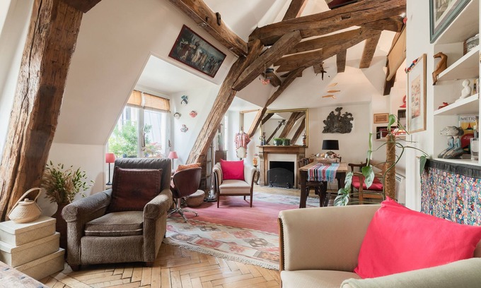 With its original 400 year-old beams, hardwood floors and antique floor tiles, this feels like a country home in the heart of Paris. Quiet, open and airy with skylights throughout, it is furnished for comfort and coziness in warm, rich hues. My home can be your home away from home during your stay!