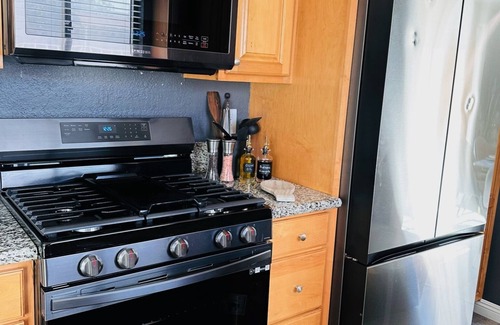 Welcome to this charming house in Las Vegas. This soothing and quaint property offers a gorgeous retreat for guests. With 3 bedrooms, including 1 king bed and 2 queen beds, and 3 bathrooms featuring amenities like a bathtub and shower, your comfort is our priority. The additional spaces, including a cozy living room with a sofa bed and an office with a futon, provide extra flexibility for your stay. Enjoy the convenience of heating, a washing machine, WiFi, AC, a hair dryer, and an iron. Whether you're here for business or pleasure, we look forward to welcoming you to our place.