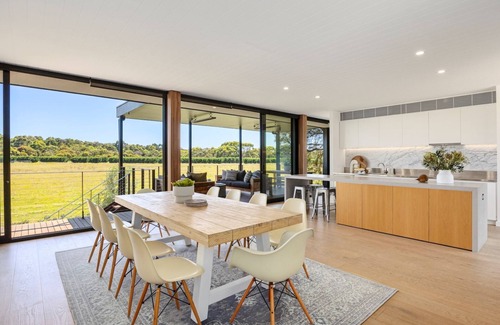 Set on the village fringe just moments from the coast, the house is a sleek retreat that seamlessly melds style and functionality for vibrant family holidays and entertaining, offering outstanding leisure with a north-south tennis court, heated (solar) plunge pool, native garden and beautiful rural vistas.