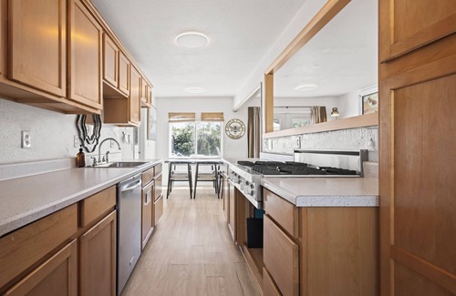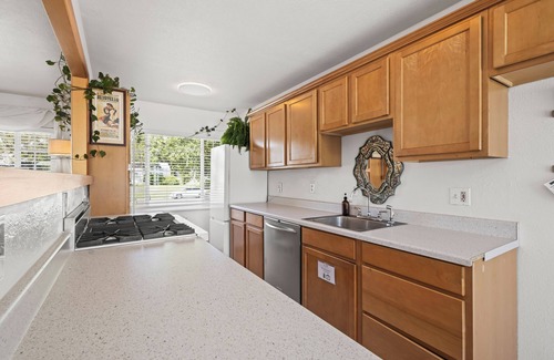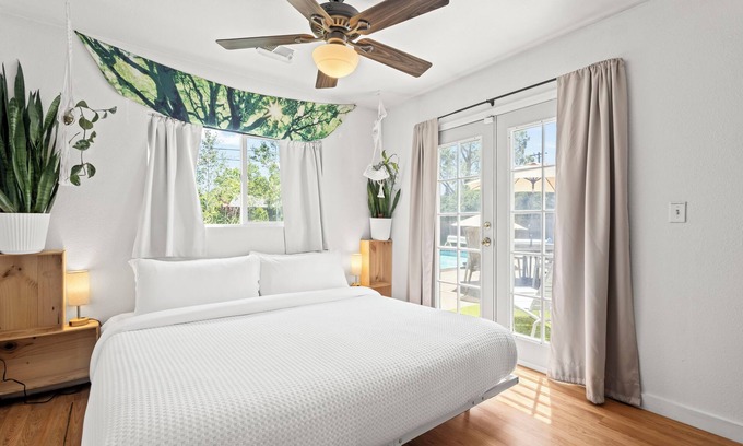 Soak up the sun by the sparkling pool, surrounded by lush greenery. Enjoy a game of Jenga by the pool, then relax under the stars at night. The pool is open from June to October, with a spacious gazebo, comfy loungers, and a Traeger grill for outdoor dining. Please bring your own wood pellets for the grill. French doors open from the primary and twin bedrooms, plus the living room, connecting the indoors to the outdoors. Savor homegrown herbs and fruits in this peaceful garden. Parking is available in the driveway, plus ample street parking. Walk to the nearby lightrail! The home also offers 110 and 220 power/RV hookups at the front.