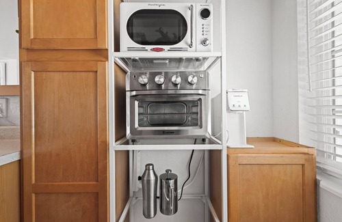 The kitchen is stocked with everything you need to cook like a pro, from cookware and bakeware to stylish dishware. Start your mornings with the kuerig coffee maker, complete with a generous supply of complimentary coffee. Please note that we do not have a traditional oven, but we do have a cooktop, a microwave, and a 7-in-1 convection toaster oven that can air fry, bake, toast, broil, dehydrate, and warm.