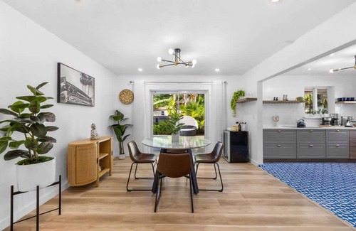 Tucked away in a quiet neighborhood, this 3-bedroom, 2-bath home offers relaxation and convenience just minutes from Hollywood Beach and Downtown Hollywood. Enjoy a private heated pool, a modern kitchen, and spacious patio with BBQ grill surrounded by palm trees. Additional amenities include beach essentials, Smart TVs, and high-speed WiFi.
