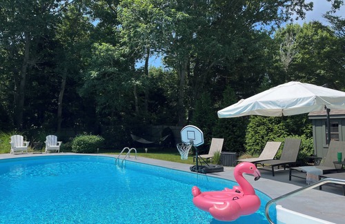 This home was recently renovated and professionally designed. Upgrades include two new bathrooms, plus brand new outdoor shower, all new furnishings, new paint and hardwoods. Central air throughout. Huge, private backyard includes heated, inground pool and plenty of room for lawn games. Or enjoy the shade and take a nap in the hammock. Two decks and a patio allow for lots of room to spread out and enjoy the beautiful setting. Cook dinner on the brand new BBQ or the brand new kitchen appliances. After dinner relax by the firepit, watch a movie, or work on a puzzle at the game table in the living room. There is plenty of room to spread out!