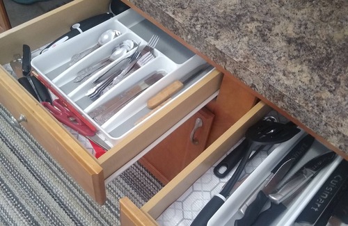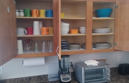 Kitchen is fully stocked with dinnerware, kitchen aids, cutlery, utensils, coffee makers, French press, grills, blenders.