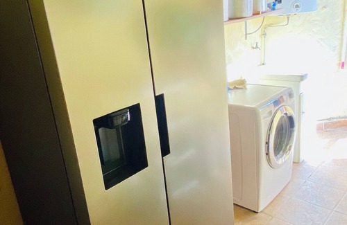Large Kitchen recently refurbished, with a 5 ring Stainless Steel Gas Hob, Electric Fan Oven, Built in Microwave, Dolce Gusto Coffee machine, Filtered Coffee machine, Dishwasher, Double sink & Fresh Drinking Water Tap and double french doors leading to an outdoor mozzi mesh covered chill room with comfy sofa & seats. Utility Room with a large American style Ice making, cold fresh water dispensing Fridge Freezer, Washing Machine & a hand wash sink leading out to a whirly bird washing line.