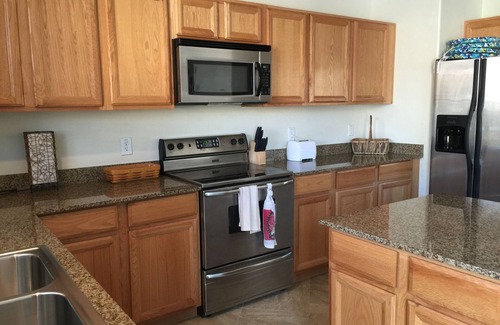 HEATED POOL INCLUDED IN BOOKING PRICE!!! Pools get cold here but ours is 83 degrees! so jump in and enjoy. The backyard includes charcoal grill, lounge chairs, brick pavers. This home an easy stay. Step into this beautiful 3 bedroom 2 full bath home with powder room on first floor. The master bedroom has a 50" TV with a King size bed with attached master bath with separate sinks and soaking tub and private toilet closet. The other 2 bedrooms offer Queen beds. There is a versatile loft sitting area with a queen sofa sleeper available for extra guests as well. The living room downstairs has a 60" TV and is open to the kitchen. We offer high speed WiFi and Roku box and local channels. Gorgeous granite counters, side by side fridge with ice in the door, coffee maker and all other necessary items needed in Kitchen. There's local shopping & Restaurants in walking distance, or have it delivered after that long fun day. Don't forget to enjoy an easy walk to the park right down the street. This is a very clean, fun affordable rental you will enjoy. Surprise Arizona is rated as one of the safest cities. This home is conveniently located off the 303 expressway to gain access to anywhere in the AZ Valley.
