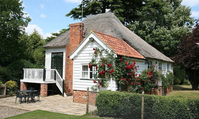 Lodge cottage is a beautiful thatched holiday home with access to a heated outdoor swimming pool and a large garden set in the 5 acre picturesque grounds of Hacheston Lodge near the Suffolk Heritage Coast. It is a detached colonial style house, with a balcony and verandah offering accommodation for 5 people. The pool is open (morning and evening) from the end of May to the end of September. The cottage has a spacious and light first floor sitting room / dining room with French windows opening onto the south west facing balcony - a wonderful place to sit on a warm summer's evening. The three bedrooms are on the ground floor below. In addition to the verandah and balcony, guests have exclusive use of a large grassed garden.