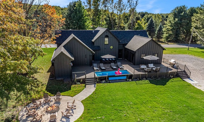 Thoughtfully designed and thoroughly renovated with you in mind, Offroad Onyx is the ideal vacation destination for a luxury getaway in the pristine winter landscapes of Western Michigan. Featuring a heated container pool (104 degrees!), this is the perfect place to relax, reconnect, and recharge during the holiday season or to bring in the new year. Located across from Silverback Speedway and on 20 acres, you can’t beat the location. Complete privacy. It has been packed with amenities including 10 beds, 3 car garage, large parking area, EV charger, heated pool, fire pit, fully stocked kitchen, AC, & game room!