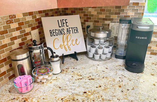 Our upscale kitchen is fully equipped with top-of-the-line appliances, water filtration tap, and ample counter space with a huge island. Whether you prefer to whip up a culinary masterpiece or simply enjoy a morning coffee, this space is designed to cater to your every need. Keurig & French Press coffee makers are ready and waiting for our guests, along with a selection of K-Cups, quality ground coffee, a selection of sweeteners, as well as an assortment of snacks so guests are all set!