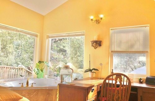 The indoor bedroom jacuzzi enjoys views of the cliff, wood stove, king bed and one of the two wooden executive desks. Touches of granite and marble are added highlights throughout.