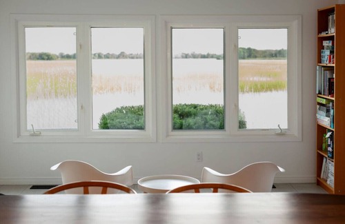 This comfortable one level, three-bedroom, two-bathroom vacation home features simple and clean contemporary décor and an open concept living and dining area with large windows and lovely calming views of Huycks Bay.