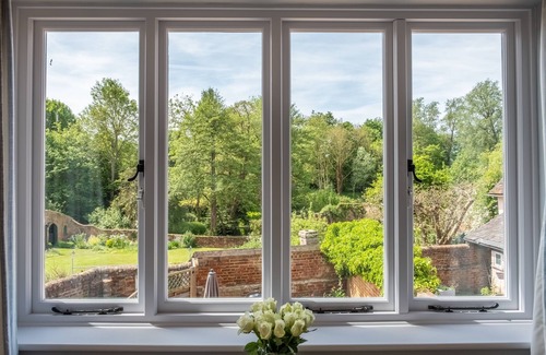 Look-Out Sitting Room – Large three-seater sofa and armchair orientated around a West facing wall of glass providing wonderful views over the back of ancient houses, immaculate gardens, the church and rolling country-side. A 40” smart TV is enveloped by built-in shelving also containing ornaments, books and board games.