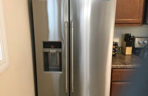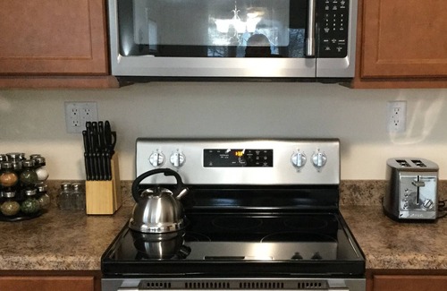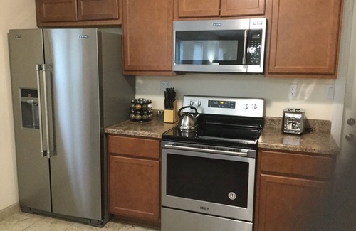 New modern appliances such as, refrigerator, stove, oven, microwave, dishwasher and coffee maker.