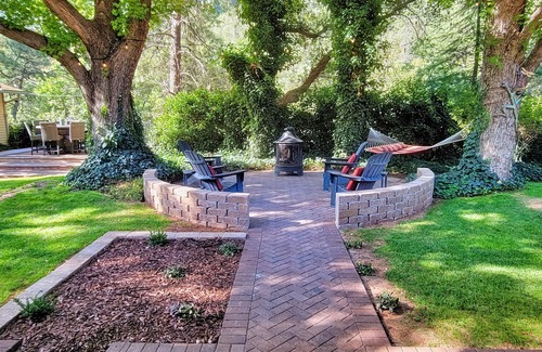 The Orchard House on Sedona Oak Creek- See and hear the pleasant calming sounds of Oak Creek & wind in the trees from an Eden-like private canyon back yard with ivy & wild roses grown along the back fence. This place is so peaceful. Canyon walls surround you, as Oak Creek runs year round. Retreat to this charming 4 bedroom, 2 bath canyon cabin with a deck overlooking the creek. It also has a separate room over the garage that can be used as a 5th bedroom but has to be accessed from the outside. This house is referred to as The Orchard House, due to the several varieties of apple, pears, peach and cherry trees, with grape vines along southern fence line. Also, let's not forget the two almond trees in the front....everything grows here!