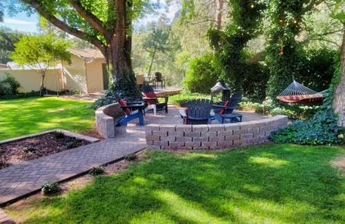 A wood-burning brick fireplace in great-room, a vintage replica stove in kitchen make for a great cabin-like setting. There is ample room inside & out for friends & family. A covered porch on both front & back patios compete for absolutely amazing views of mountains, creek, birds and stars! You will find that you will spend a lot of time in the backyard - with the deck/seating area overlooking the creek (our favorite place), a rope swing, a porch swing, mature trees, 2 large bird feeders, fire pit, a gas cooking grill and a charcoal grill for convenience, Sonos speakers and lights strung throughout. This backyard truly has a magical touch of nature that any age will truly enjoy. Although the yard does not have direct access to the creek, it is only about a 3 minute walk to it.
