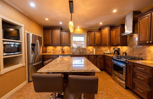 This lovely home boasts a wealth of amenities tailored for relaxation and entertainment. You'll love the large heated pool, with options for heating from April to May and September to October, creating a resort-like experience right in your backyard. Cook gourmet meals in the chef's kitchen, featuring a six-burner stove and stainless steel appliances, or enjoy al fresco dining under Edison lights on the covered patio. With four spacious bedrooms, including two luxurious master suites, your party will have plenty of room to unwind after the festivities. Plus, each bedroom is equipped with smart TVs, ensuring everyone can enjoy their favorite shows throughout their stay.