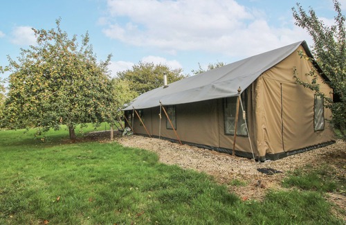 Hedgerow, a single-storey off-grid safari tent, consists of a kitchen with wood-burning range cooker, kettle and a living/dining room with two sofas and dining seating for 8. There is a woodburner (logs, kindling and flamer starter pack) and the bedrooms consist of 1 x double, 1 x bunk bed, 1 x cupboard bed. There is a bathroom with bath, basin, and WC. WiFi, fuel, bed linen, and towels are included in the rent. Outside, there is an enclosed rear garden decking with lawn, furniture, barbecue, and hot tub (in 2026), and off-road parking for three cars. Two well-behaved dogs are welcome. Sorry, no smoking. Whatever the weather, a wonderful stay awaits at Pear Trees. Note: Additional Extras: Hot Tub (in 2026) £150 per stay, pizza oven with wood & utensils: £40/per stay, extra towel bundles: £20. Note: Early or Late checkout: £50. Note: No WiFi in this property. Note: Motorbikes are not allowed on the farm.. Note: Personal barbecues are permitted but must be raised off the ground and attended by an adult at all times. Note: No electric or gas barbecues allowed. Note: If making a fire, the fuel, logs and coal have to be purchased on site. Note: This property requires a Good Housekeeping Bond of £200.
