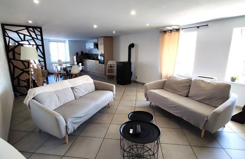 Ground floor: large living room, kitchen (microwave, freezer). Lounge (TV, pellet stove - pellets provided). Shower room, WC (access via 2 steps). Upstairs: 1 bedroom (1 double bed, 2 single bunk beds), 1 bedroom (1 double bed, TV). Bathroom with WC. Electric heating. Cleaning option €50. 1 small pet accepted. Just a stone's throw from the Ardennes Natural Park, come and enjoy the tranquility of the surroundings. This stone house is semi-detached to the owners' house, with a separate 800 m² plot (swing).