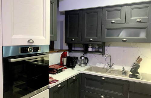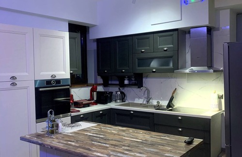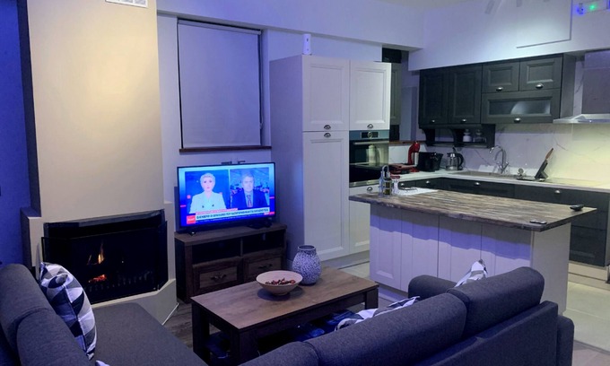Luxury suite of 90 sqm fully equipped with two bedrooms, fireplace, kitchen and living room. An impeccable apartment that combines luxury, traditional architecture and contemporary elements with earthy colors. It has a view of the village square and the green mountains of Epirus. The suite is located in a traditional village surrounded by green mountains with a fantastic view of the forests of the area. It is at a perfect distance of 20 minutes from Zagorochoria, the Voidomatis river, Ioannina and all the various sights of the area.