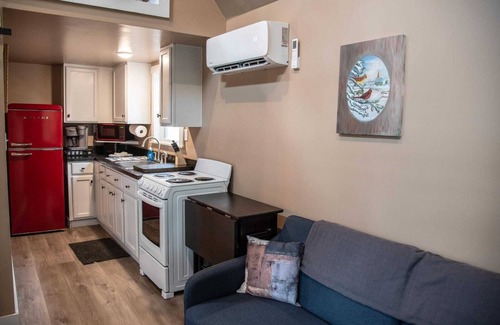 Queen loft bedroom, simple modern bath, outfitted kitchen with retro bright red refrigerator and all you need to feel right at home.