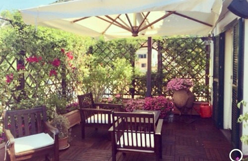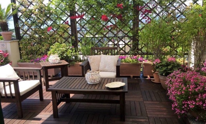 A large, sunny terrace (90mt) surrounded by flowers where you can enjoy a well-deserved relaxation pampered by good music (system with external speakers) or consume your tasty recipes.