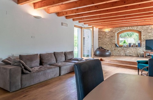 In this domicile you will be able to feel directly at home and relax with your family. The mixture between rustic and modern design offers you a very special atmosphere. Further, you will find some cozy furniture where you can sit back with a vacation reading or for exciting conversations with your loved ones. The exposed beam ceiling, wooden floorboards and visible stones on the house walls make the house bloom with naturalness. Imagine waking up in this romantic house, enjoying your breakfast and morning coffee together on the terrace with the picturesque view while you have enough time to mentally prepare for the day. On the large property you will find outdoor games for the young guests and a barbecue for the adults.