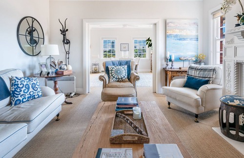 The main living area of the apartment, looking out over the harbour from nearly all sides, is bedecked in opulent soft furnishings and eclectic country charm. Whether you are tucking into a meal in the dining room, or lounging with a book in the elegant living room connected, the high ceilings and wide windows create a bright and open atmosphere for utmost tranquillity.