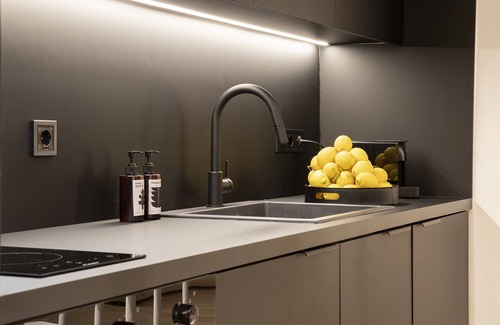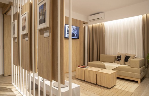 "Sihna" apartment is a space inspired by local traditions but with a modern approach and abstract aesthetics. It consists of a bedroom with a queen-size bed and a spacious living room-kitchen with a sofa that converts into a comfortable bed for two. The condo is equipped with smart flat-screen TVs as well as high-quality Bluetooth speakers to enjoy your music.