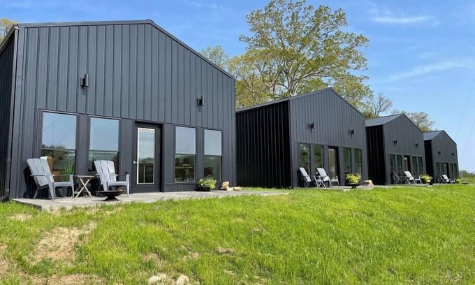 Escape lakeside 11 miles south of historic Hermann, MO. This property is a 200-acre ranch with 4 newly constructed modern cabins nestled on a 7-acre lake with kayaks and fire pits available for guests. The cabins sleep 3-5 guests with a master bedroom and open air loft. Experience the rustic setting in a modern cabin with better than hotel amenities.