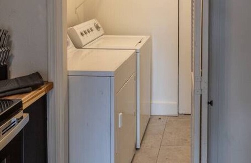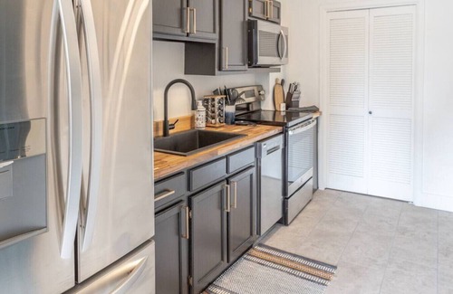 This newly updated first floor unit offers a clean, modern feel. Open living/dining area just off kitchen includes leather sofa, TV, dining table and workspace. Bedroom down hallway includes queen bed and dresser with access to back porch. Closets and shelving available throughout the space.