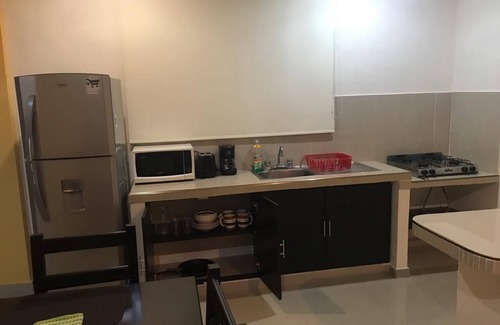 El departamento; cuenta con utensilios para cocinar (ollas, cucharas, sartenes, espátulas, vasos, tazas y platos).