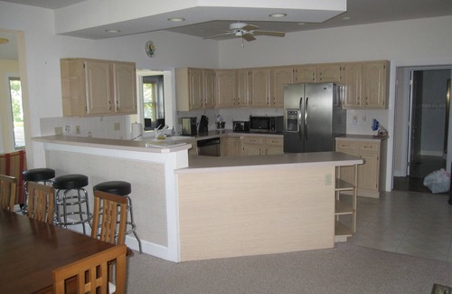 In addition to the main living room and sunroom, there is a den and a large rec room. It has FIVE SPACIOUS BEDROOMS and FIVE FULL BATHS. There are TEN BEDS (1 king, 3 queens, 4 fulls and 2 trundles). There are no bunk beds. It is one of the largest rentals in the area and it certainly has more full baths than any of the competition.