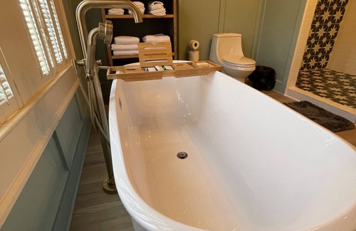 Newly renovated cottage designed by Kristy Brown of Herstory Home. Large private bathroom with soaking tub and huge walk-in shower all fitted with Brizo Luxe Gold fixtures. All new appliances including NG stainless range and oven, dishwasher, and microwave. Everything you will need to entertain guests. Stunning modern and eclectic furniture manufactured and designed by Herstory Heirlooms throughout the dining and living area. Also have super-fast wireless internet and private work space. A place to relax and entertain… it is home!!!