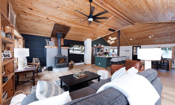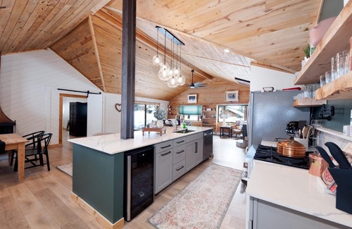 During your stay, relax in front of one of the three fireplaces in our home (2 wood burning, 1 electric), soak up the natural light in the sunroom, cook an amazing meal for everyone to enjoy in our fully functional kitchen with gas stove, or enjoy the sounds and beauty of nature. Thoughtful additions in the home include two workspaces, a towel warmer in the main En suite bathroom, and a wine cooler in the kitchen. There are two main TV watching locations - in the living room and in the sunroom.