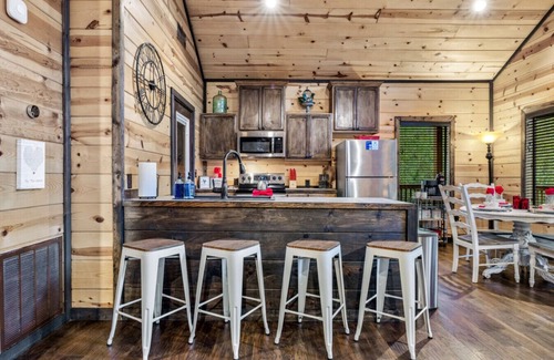 Hey There Delilah sleeps up to 4 guests with a king suite and a queen pull-out couch, and it's pet-friendly (dogs only), so you can bring your furry friend along too. The bathroom features a soothing bath tub, double vanity, and a shower with two separate shower heads. The fully stocked kitchen is equipped with a coffee machine and K-Cups for your morning brew, as well as basic spices for cooking meals in the cabin. The cabin's high ceilings create a feeling of spaciousness and grandeur.