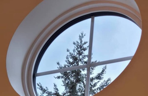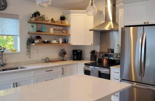 Open concept living, dining and kitchen area, with ceiling fan and vaulted ceiling. Spacious Island with 3 bar stools. Quirky circle window adds charm to room. All the paintings in cottage are by Owners Mother, a member of the Federation of Canadian Artists and Burnaby Artists Guild.