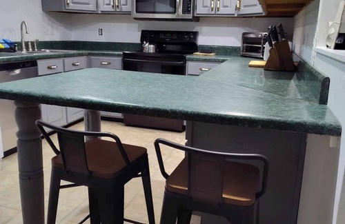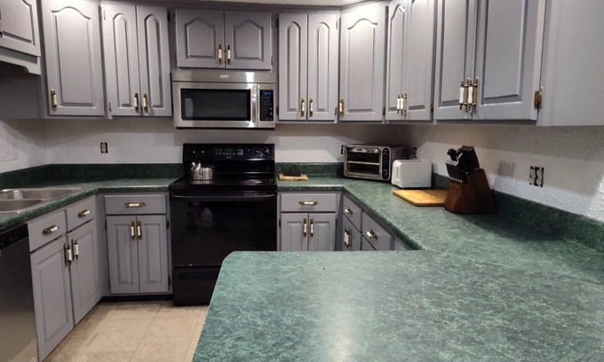 It offers a washer and dryer, a full kitchen, and 2 water heaters to ensure hot showers.