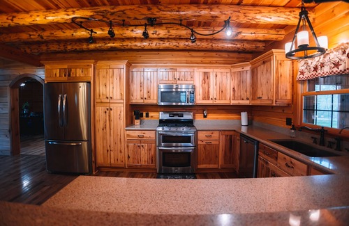 Dreamy log cabin built in 2012. Private setting with security gate, covered bridge, and long lane. Furnished with five bedrooms, a futon, and four bathrooms.