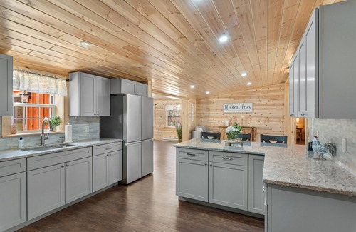 Hidden Acres features a spacious main house that comfortably sleeps up to six guests. With three beautifully appointed bedrooms and 2.5 bathrooms, this cabin is designed with relaxation in mind. The master bedroom includes a luxurious queen-sized bed accompanied by an en-suite master bathroom, complete with a stone shower, a soothing soaking tub, and a double vanity. The second bedroom also features a queen bed, while the third offers a full-sized bed, ensuring ample sleeping arrangements for your group.