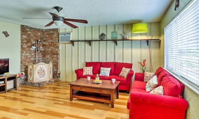 The home has an expansive living area featuring 2 plush red couches, a wooden coffee table, and flat-screen Smart TV with which you can use your own Netflix, Amazon, and Hulu accounts - the perfect setup for movie nights!