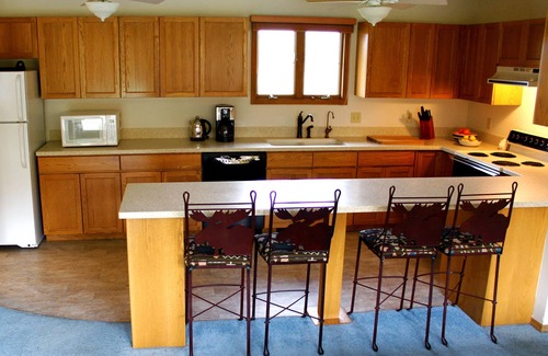 The kitchen is famously well equipped, has ample counter space and is flanked by a large breakfast bar with 4 bar stools, opening to the formal dining area with table and chairs. The dining and adjacent living areas boast magnificent picture windows facing the lawn and a grove of cottonwood trees.
