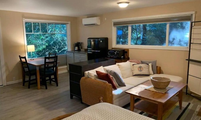 Welcome to your hideaway studio on a quiet, forested lot, yet just a few minutes away from essential services and twenty minutes by car from downtown Seattle. You'll enjoy the entire studio with a queen bed, one bathroom, sitting area, and a kitchenette with a fridge, microwave and coffee maker. The studio is attached to our home and has a private entrance from the back yard. Take a stroll down our trail to McAleer Creek and enjoy the Overlook Deck with your morning coffee or an afternoon beverage.