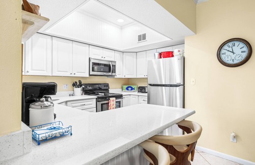 Beach Cottage 178 is nested among the natural landscaping of Hidden Dunes and is one of the closest cottages to the beach. The spacious living room has an open floor plan leading to a screened in porch. The living area flows directly into the dining area with seating for 5 at the table. There are also two additional bar seats at the breakfast bar. The master bedroom has a king size bed, walk in closet, twin sleeper loveseat, and private bath. The second bedroom has two twin beds and a shared bathroom. The fully stocked kitchen has everything you will need to enjoy an evening dining in the condo. Spend mornings and evenings enjoying the beautiful Florida weather on the screened in porch. . The unit is equipped with a washer and dryer!