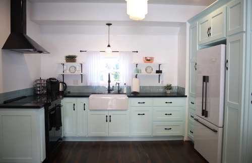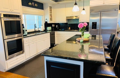 The main residence has 4bedrooms/5bed + 1 crib (optional) and 1 large sectional couch with 4 recliners, 3 full bathrooms and can comfortably sleep 14 including the guest villa’s. The upper Guest Villa, has its own entry and private deck with market lights, outdoor seating, and an open floor plan with 1 king sofa sleeper, full kitchen, breakfast nook, 1 full bathroom and access to the main house laundry room. The lower Guest Villa also has its own private french door entry off the main driveway, 1 king sleeper sofa, full kitchen with view of backyard, breakfast nook, 1 full bathroom and its own laundry room.