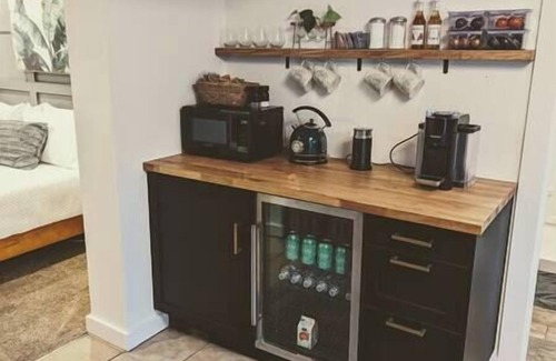 The sitting area includes a mini-fridge, microwave, electric kettle, frother and Nespresso machine. We provide a selection of coffee, tea, sugar, stevia, creamer, instant oatmeal and bottled water for you to enjoy.