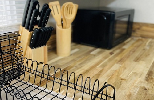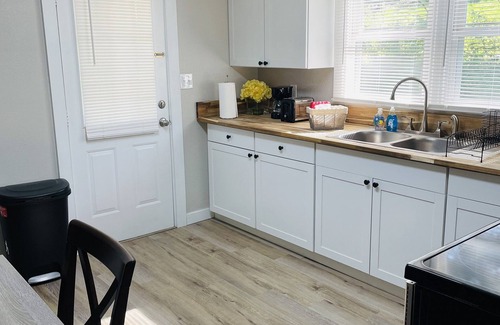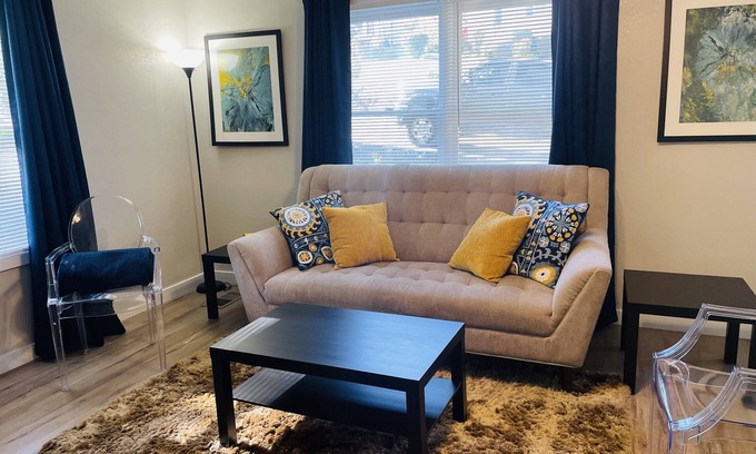 As soon as you enter the property you will step into the living room. This room has a comfy tufted sofa to watch TV or interact with guest who is in the kitchen as they are adjoining rooms. Fully appointed kitchen if you enjoy cooking. A coffee station with a Keurig is also available during your stay. Bedrooms have a queen size bed that is super comfortable according to past guest and living room has a sofa with two modern acrylic chairs (no tv in bedrooms).